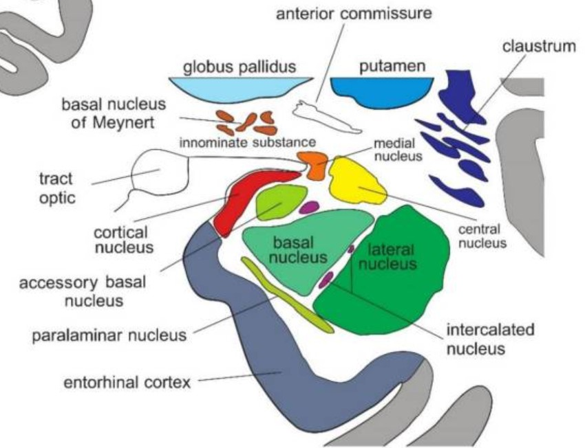 The nuclei of the amygdala are categorized into three groups; the basolateral amygdala group (BLA), which include the lateral nucleus (LA), the basal nucleus (BA), and the basomedial nucleus (BM). The cortical group, comprising the nucleus of the lateral olfactory tract and cortical nuclei. And the centromedial group, consisting of the medial and central nucle.